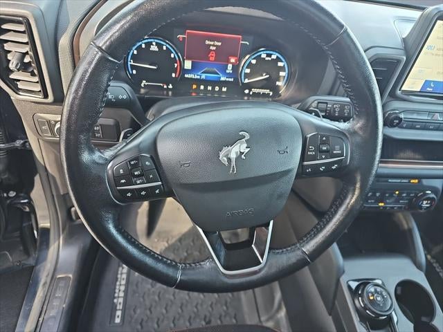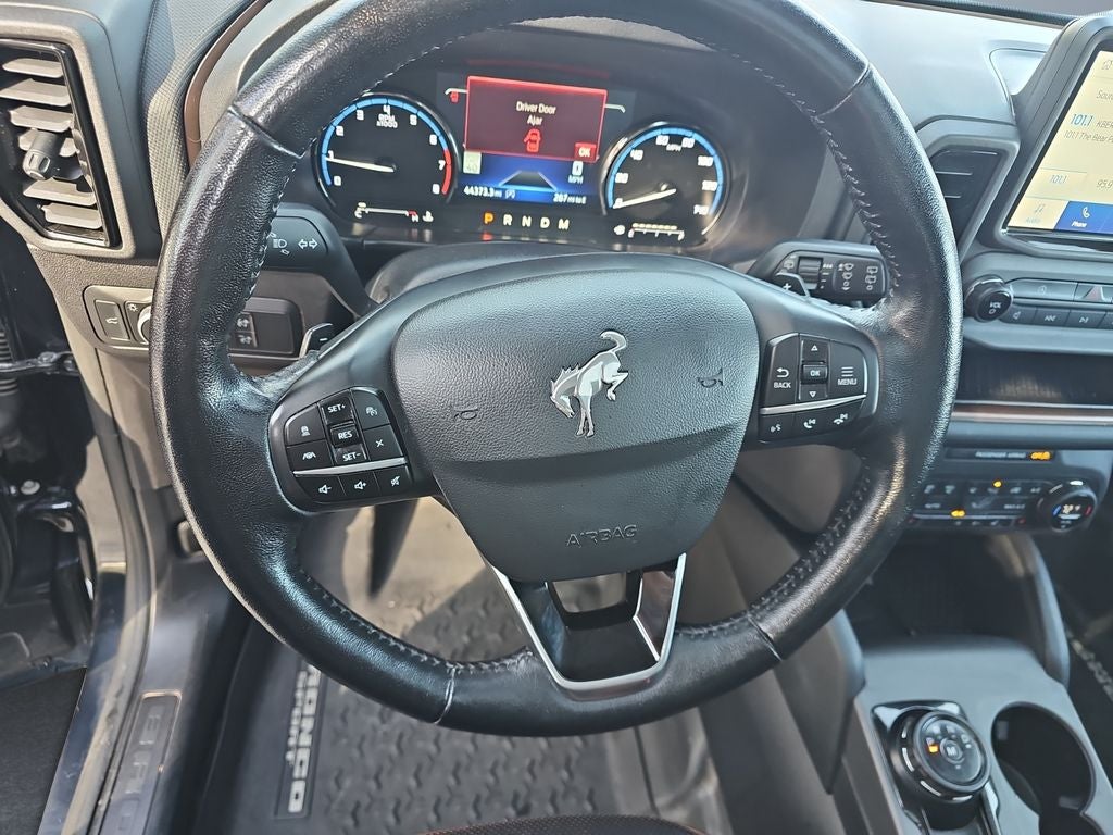 The installed navigation system will keep you on the right path. This vehicle is a certified CARFAX 1-owner. This mid-size suv offers Apple CarPlay for seamless connectivity. The vehicle offers Android Auto for seamless smartphone integration. The leather seats in the vehicle are a must for buyers looking for comfort, durability, and style. The vehicle features a hands-free Bluetooth® phone system. An off-road package is equipped on it. Start this 2021 Ford Bronco Sport from inside with remote start. The Ford Bronco Sport warns of approaching vehicles with Cross-Traffic Alert. This unit is equipped with the latest generation of XM/Sirius Radio. This vehicle has automated speed control that adjusts to maintain a safe following distance, enhancing highway driving convenience. This model is pure luxury with a heated steering wheel. See what's behind you with the back up camera on this 2021 Ford Bronco Sport . Impresses the most discerning driver with the deep polished blue exterior on the Ford Bronco Sport.